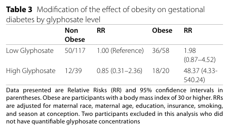 按肥胖診斷分層的、高草甘膦濃度參與者中GDM病例的分布呈現(xiàn)在表3中。幾乎所有(90%)同時患有肥胖和草甘膦濃度高的個體都被診斷為GDM。與不肥胖且草甘膦濃度較低的個體相比,其患GDM的風險顯著升高,但置信區(qū)間較寬(RR 48.37,95% CI 4.33–540.24)。草甘膦(上四分位數)與BMI的粗略交互作用p值為0.008。草甘膦作為連續(xù)變量與BMI的交互作用p值為0.02。以下分析使用草甘膦的上四分位數作為暴露因素,因為這可能在臨床上更有用。