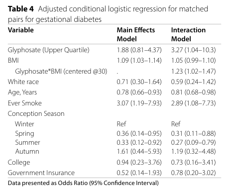 在匹配對模型的校正條件Logistic回歸中,當包含交互項時,草甘膦濃度處于上四分位數的參與者發(fā)生GDM的幾率顯著更高(比值比[OR] 3.27,95%置信區(qū)間[CI] 1.04–10.3,表4),且交互作用的OR(例如,BMI以30 kg/m2為中心時)為1.23(95% CI 1.02–1.47)。在模型中,較高的孕齡與較低的GDM幾率相關(OR 0.81,95% CI 0.68–0.98),而曾有吸煙史與較高的GDM幾率相關(OR 2.89,95% CI 1.08–7.73)。此外,與在冬季受孕的nuMoM2b妊娠相比,在春季(OR 0.36,95% CI 0.14–0.95)或夏季(OR 0.27,95% CI 0.09–0.79)受孕與處于GDM組的幾率較低相關。補充表2顯示了AMPA和MPPA的條件Logistic回歸模型,兩個主效應模型均與GDM無關。然而,AMPA(草甘膦的一種代謝物)與BMI的交互作用顯著(p=0.02),表明BMI是AMPA升高風險的一個效應修飾因子。按每個BMI中心值計算的、由AMPA升高導致的GDM校正OR顯示風險增加,然而,這些比值比僅在BMI為39 kg/m2或更高時才顯著。與種族、季節(jié)和年齡的交互作用不顯著(p值分別為0.93、0.96和0.99)。MPPA與BMI的交互作用不顯著。
